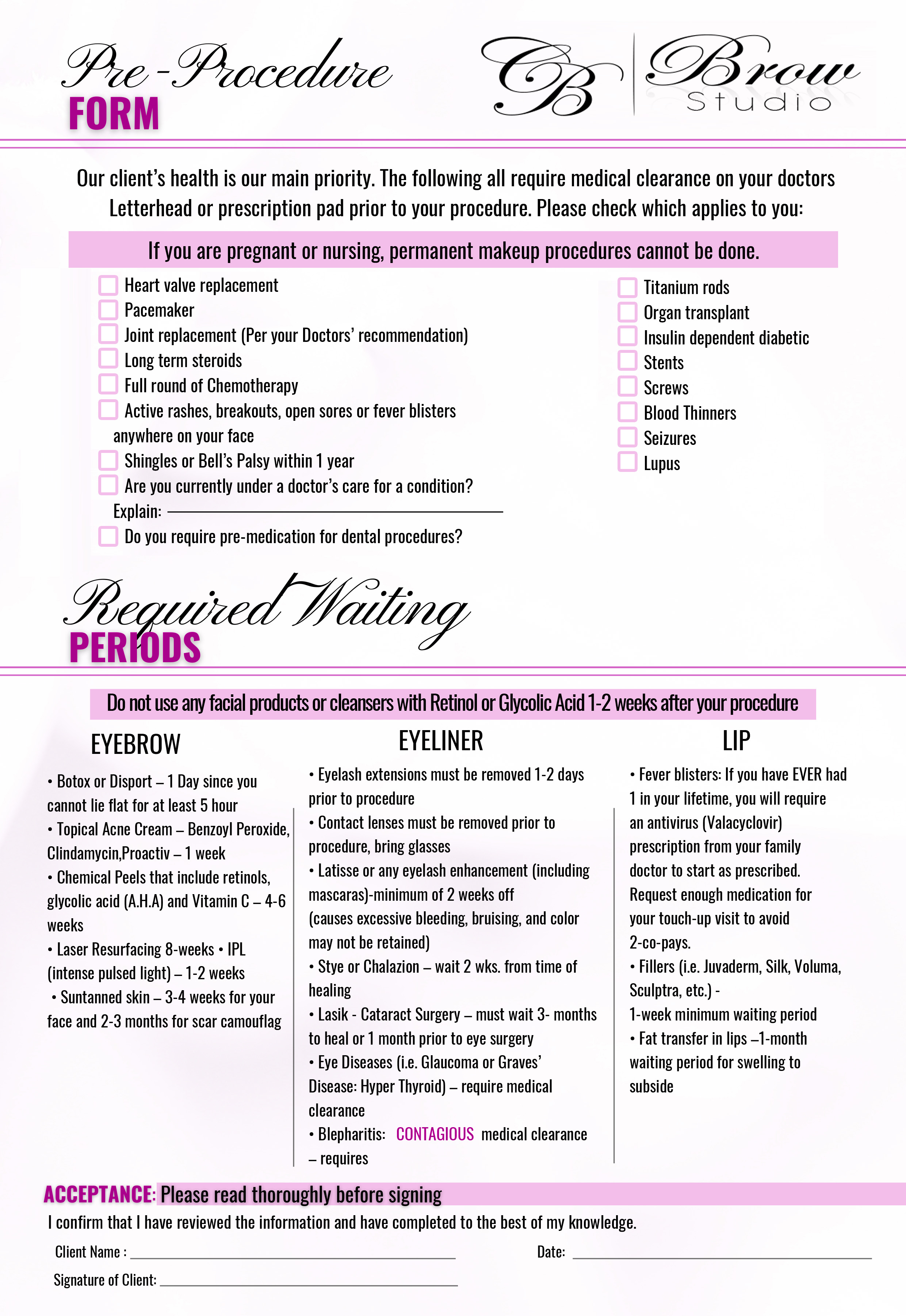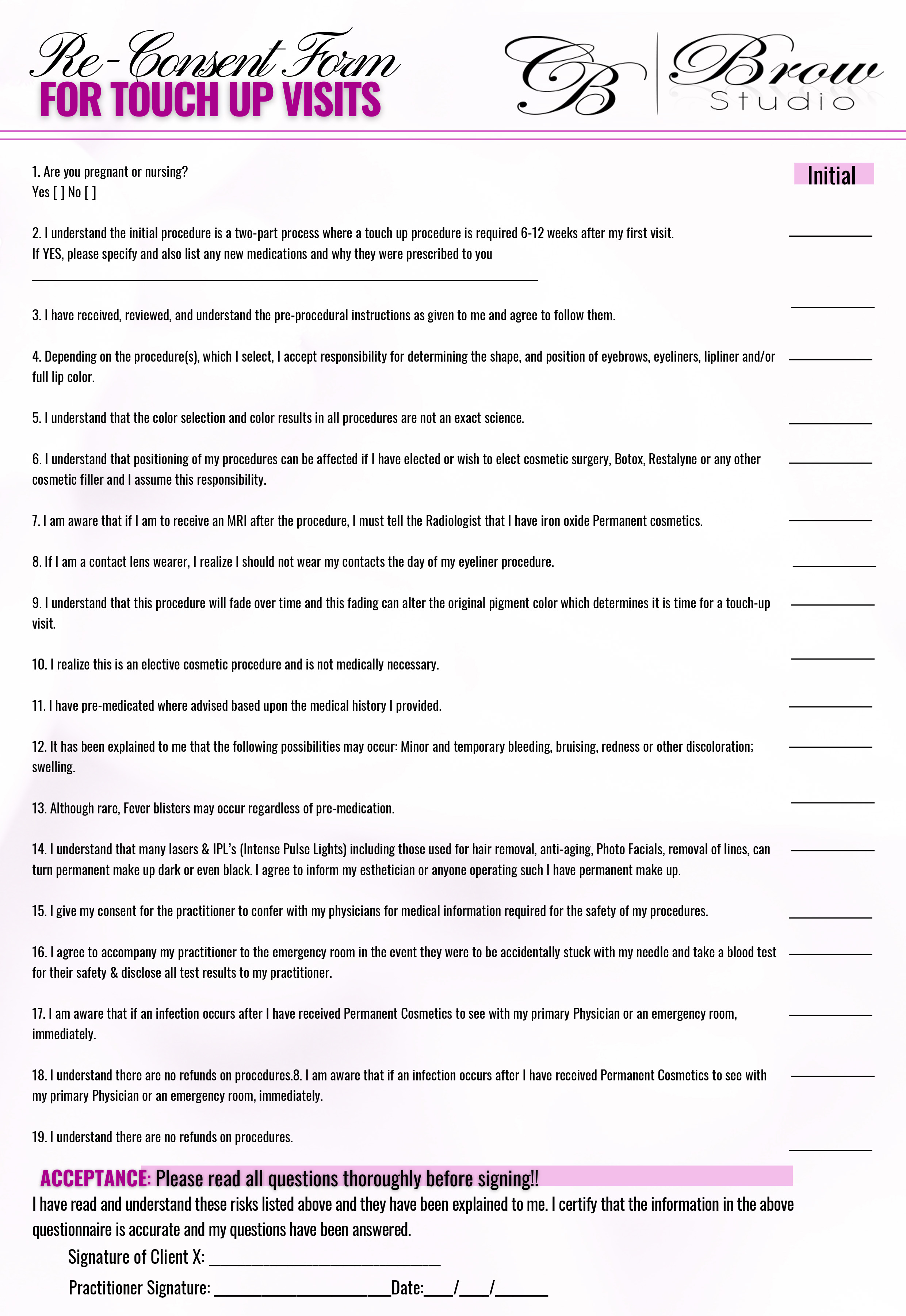 Before your scheduled appointment, it is crucial to download and carefully review the required forms. If you are unable to print and fill them out in advance, please arrive early to your appointment to allow time for completing the necessary forms and going over the relevant information. These forms cover vital aspects such as health history, procedure consent, and aftercare instructions, ensuring that we have all the essential information to provide you with the best possible care.